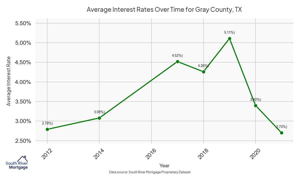 There are approximately 8 active reverse mortgage loans in Gray County. The average interest rate in Gray County is 8.08% for reverse mortgages. The average maximum claim amount (the lesser of the appraisal or lending limit), among reverse mortgage borrowers, in Gray County was $175,000.00 in 2024.