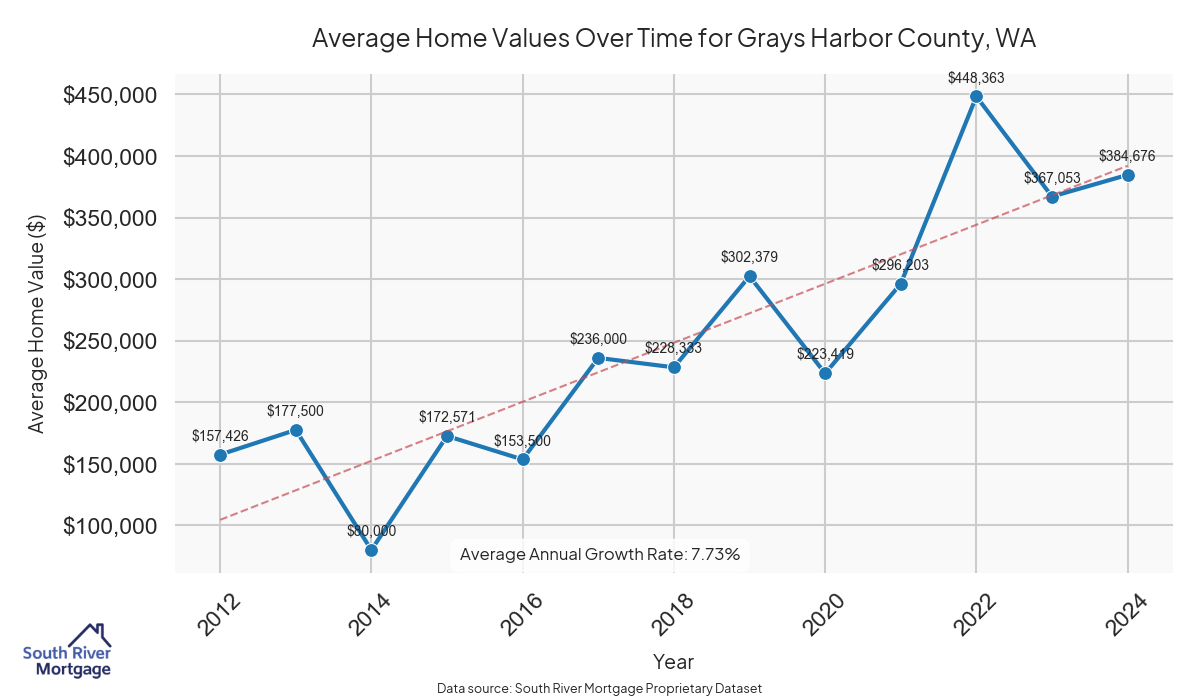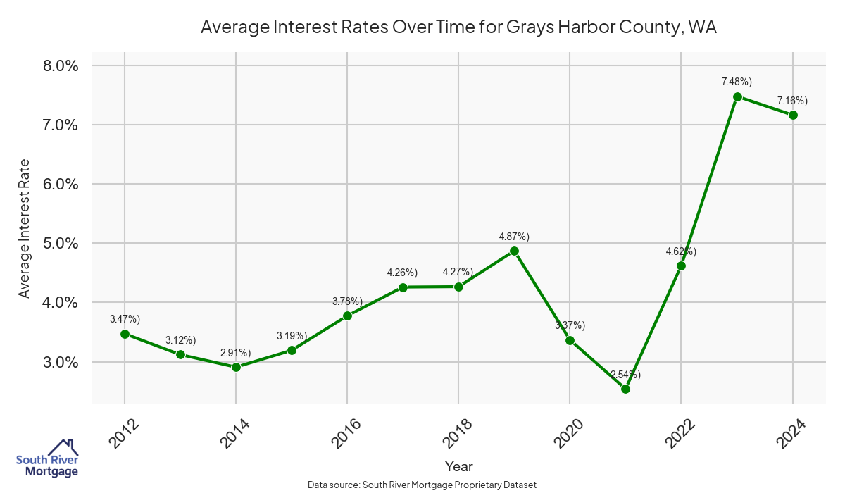 There are approximately 139 active reverse mortgage loans in Grays Harbor County. The average interest rate in Grays Harbor County is 7.59% for reverse mortgages. The average maximum claim amount (the lesser of the appraisal or lending limit), among reverse mortgage borrowers, in Grays Harbor County was $392,916.67 in 2024.