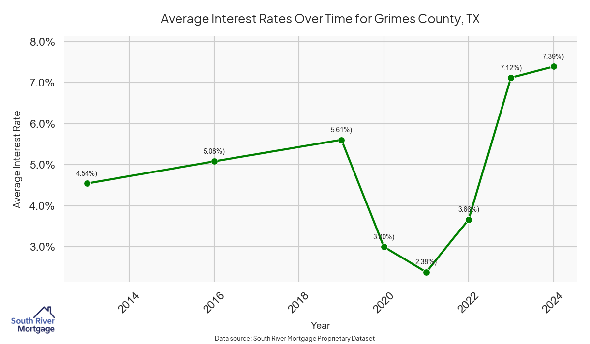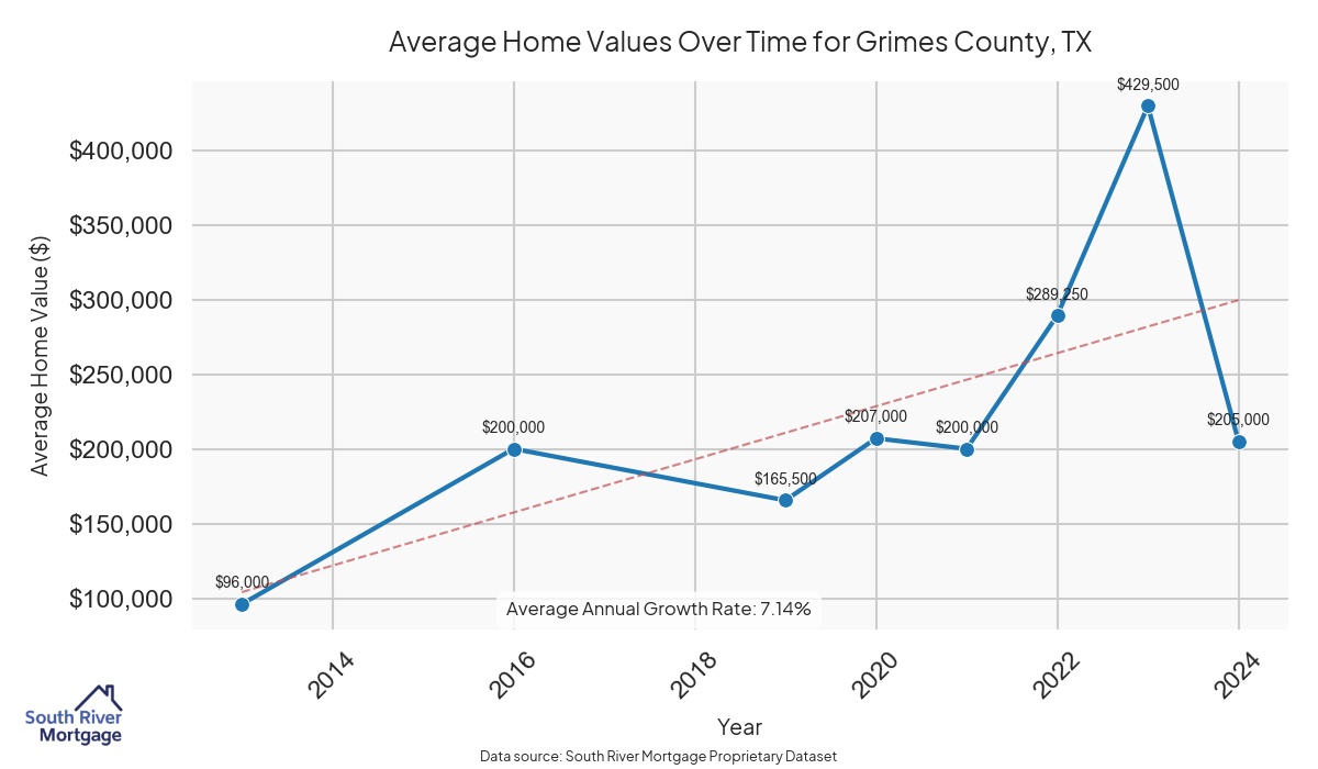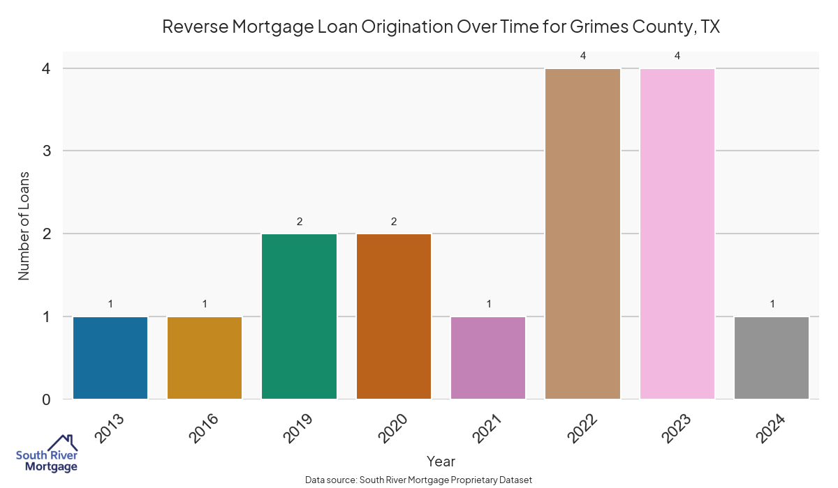 There are approximately 13 active reverse mortgage loans in Grimes County. The average interest rate in Grimes County is 6.91% for reverse mortgages. The average maximum claim amount (the lesser of the appraisal or lending limit), among reverse mortgage borrowers, in Grimes County was $481,000.00 in 2024.