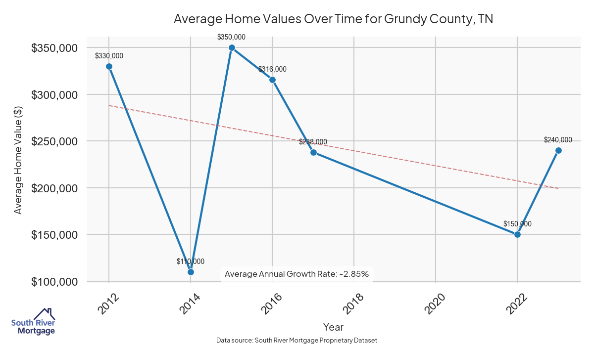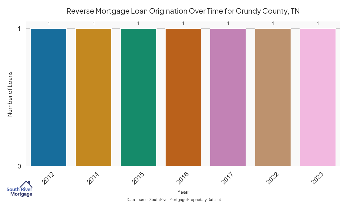 In 2024, there were 7 active reverse mortgage loans in Grundy County, Tennessee. The average home value in Grundy County is $263,152.14.