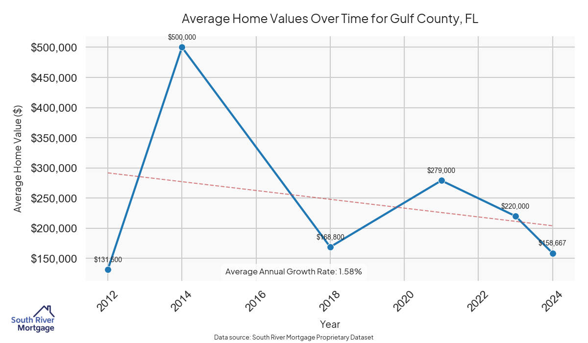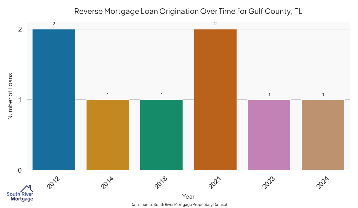 In 2024, there were 8 active reverse mortgage loans in Gulf County, Florida. The average home value in Gulf County is $448,911.75.