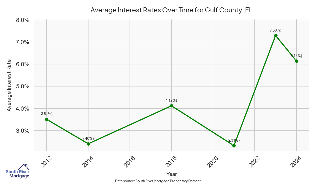 There are approximately 8 active reverse mortgage loans in Gulf County. The average interest rate in Gulf County is 7.73% for reverse mortgages. The average maximum claim amount (the lesser of the appraisal or lending limit), among reverse mortgage borrowers, in Gulf County was $225,000.00 in 2024.