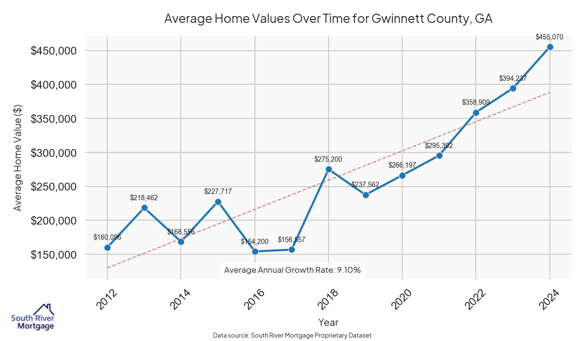 In 2024, there were 349 active reverse mortgage loans in Gwinnett County, Georgia. The average home value in Gwinnett County is $432,846.81.