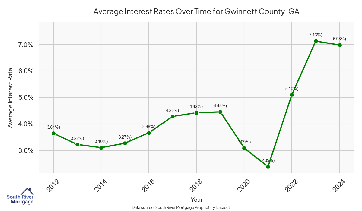 There are approximately 349 active reverse mortgage loans in Gwinnett County. The average interest rate in Gwinnett County is 7.44% for reverse mortgages. The average maximum claim amount (the lesser of the appraisal or lending limit), among reverse mortgage borrowers, in Gwinnett County was $392,297.30 in 2024.