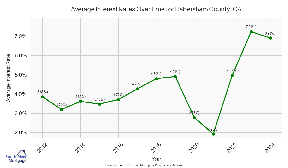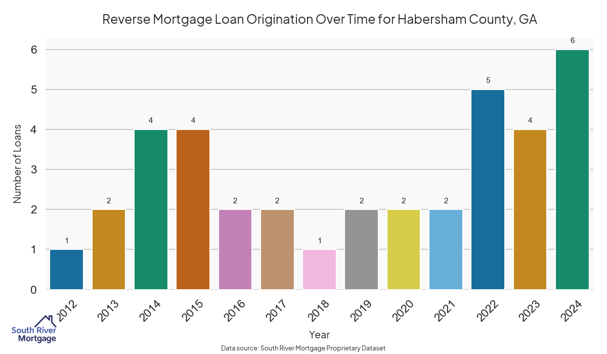 There are approximately 37 active reverse mortgage loans in Habersham County. The average interest rate in Habersham County is 7.13% for reverse mortgages. The average maximum claim amount (the lesser of the appraisal or lending limit), among reverse mortgage borrowers, in Habersham County was $319,000.00 in 2024.