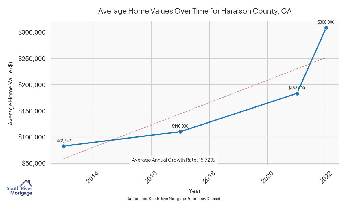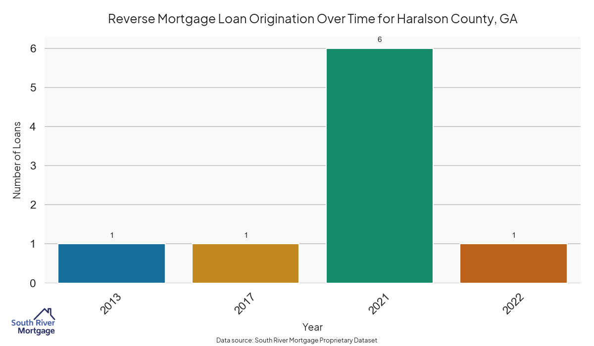 In 2024, there were 8 active reverse mortgage loans in Haralson County, Georgia. The average home value in Haralson County is $280,257.25.