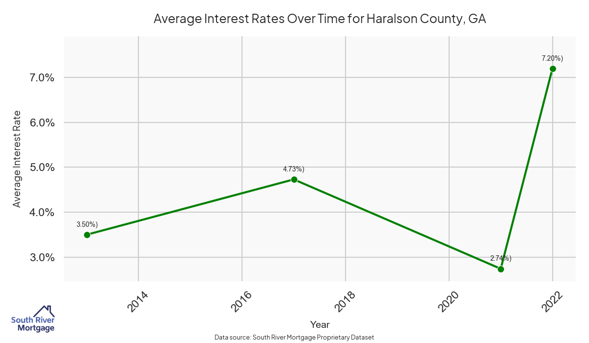 There are approximately 8 active reverse mortgage loans in Haralson County. The average interest rate in Haralson County is 7.18% for reverse mortgages. The average maximum claim amount (the lesser of the appraisal or lending limit), among reverse mortgage borrowers, in Haralson County was $335,000.00 in 2024.
