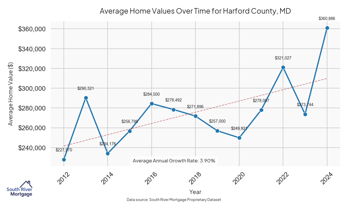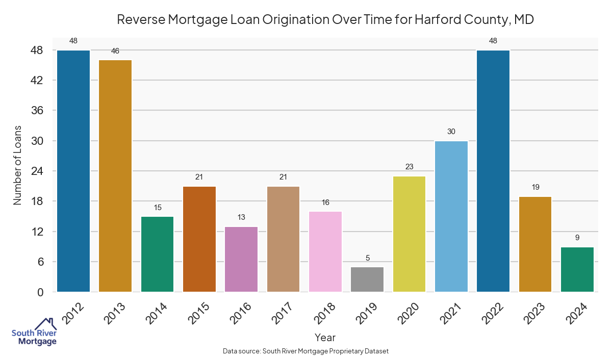 In 2024, there were 312 active reverse mortgage loans in Harford County, Maryland. The average home value in Harford County is $411,788.62.