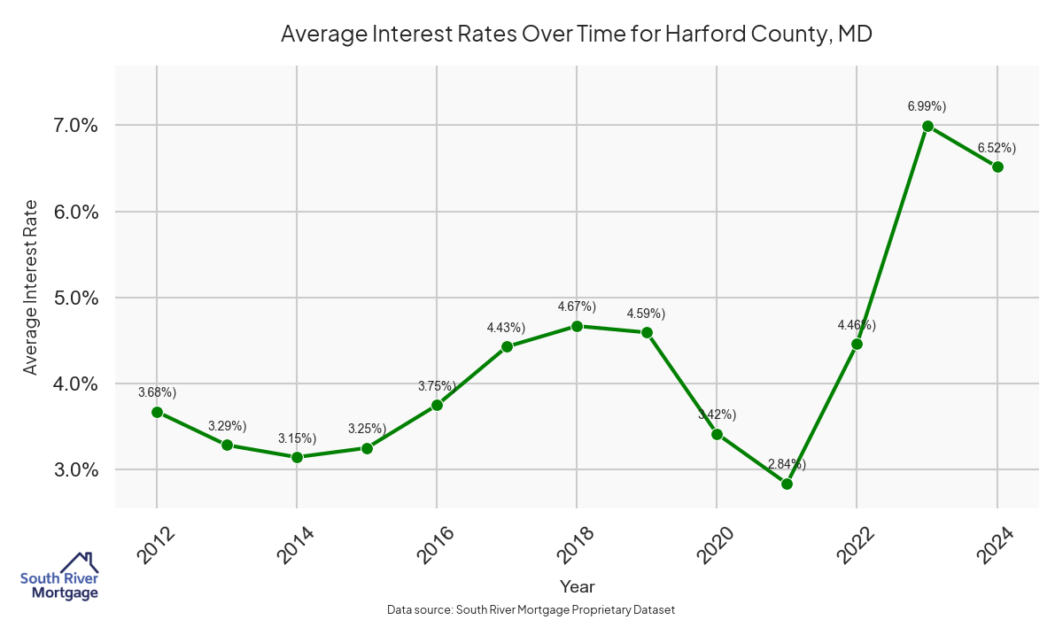 There are approximately 312 active reverse mortgage loans in Harford County. The average interest rate in Harford County is 7.67% for reverse mortgages. The average maximum claim amount (the lesser of the appraisal or lending limit), among reverse mortgage borrowers, in Harford County was $310,333.33 in 2024.