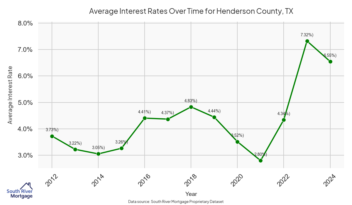 There are approximately 137 active reverse mortgage loans in Henderson County. The average interest rate in Henderson County is 7.44% for reverse mortgages. The average maximum claim amount (the lesser of the appraisal or lending limit), among reverse mortgage borrowers, in Henderson County was $457,352.94 in 2024.