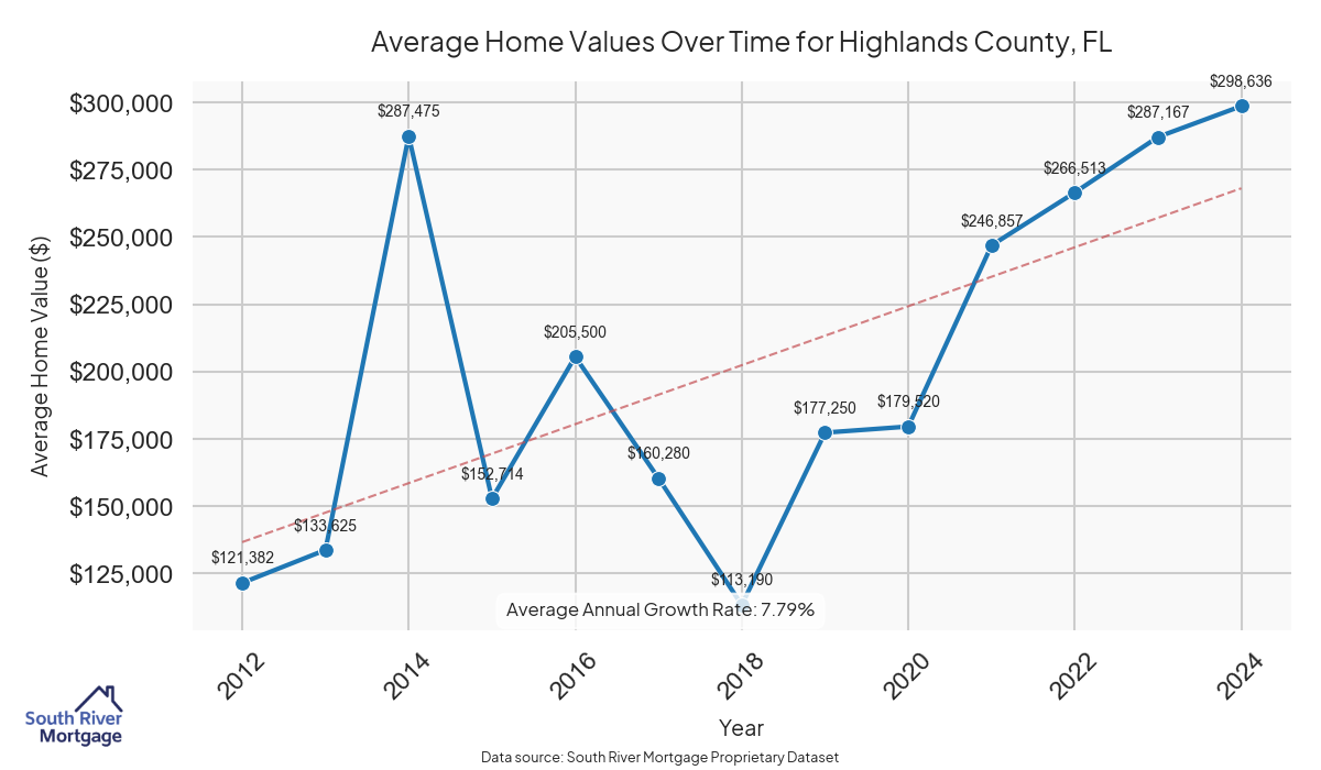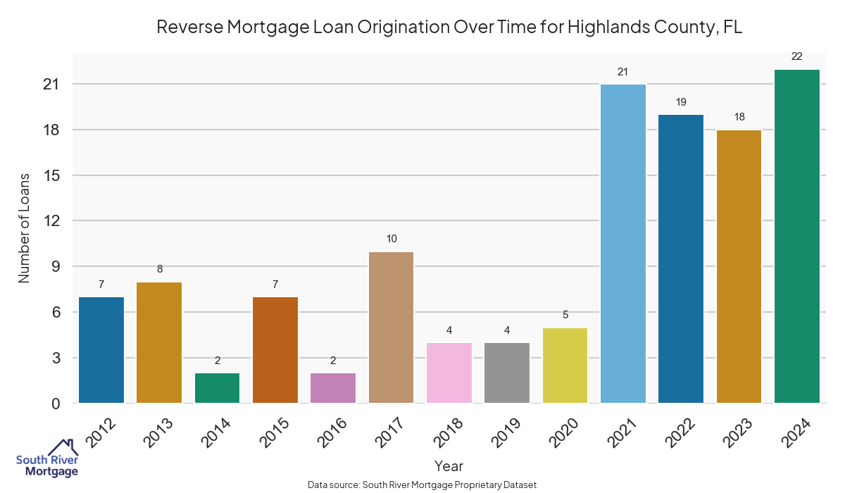 In 2024, there were 128 active reverse mortgage loans in Highlands County, Florida. The average home value in Highlands County is $326,863.21.