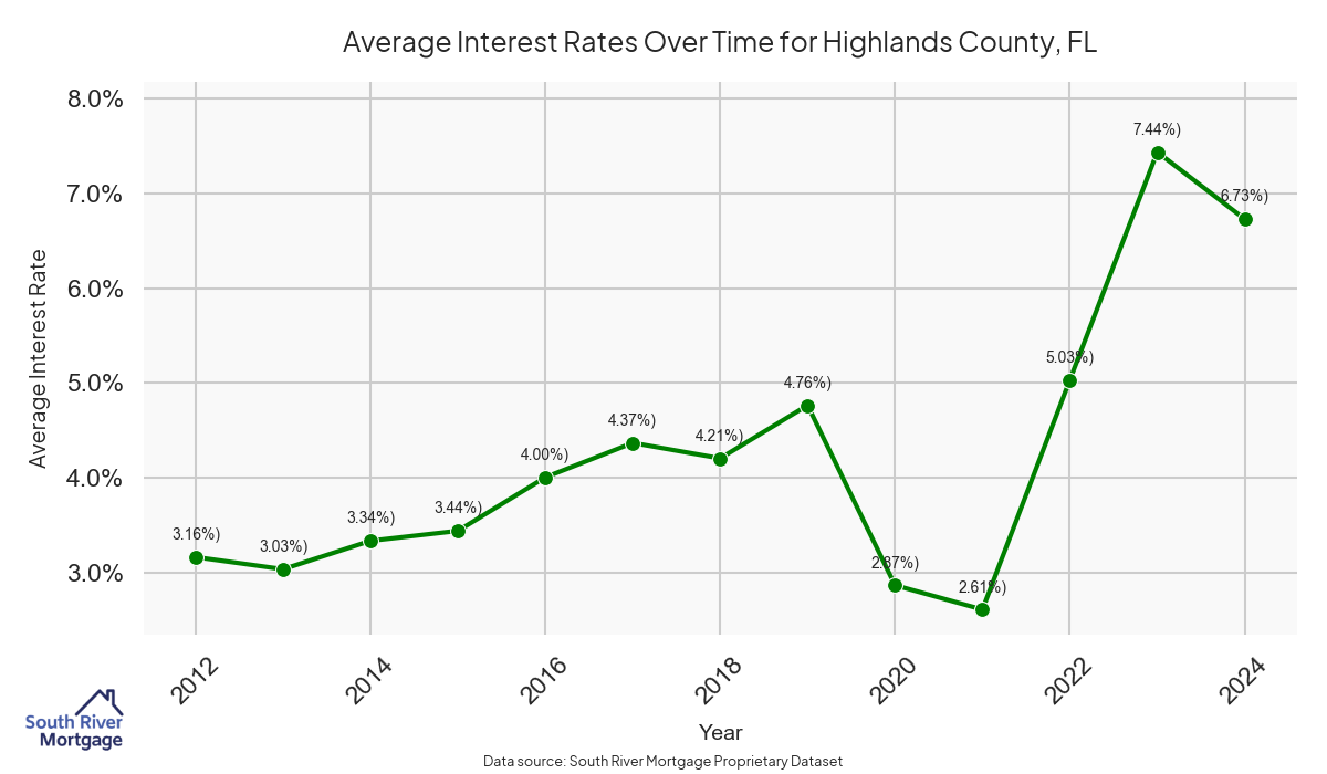 There are approximately 128 active reverse mortgage loans in Highlands County. The average interest rate in Highlands County is 7.45% for reverse mortgages. The average maximum claim amount (the lesser of the appraisal or lending limit), among reverse mortgage borrowers, in Highlands County was $296,071.43 in 2024.