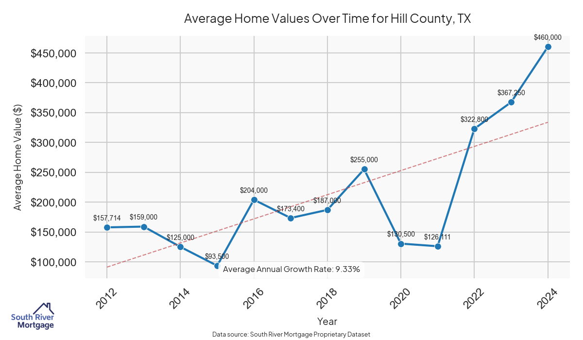 In 2024, there were 37 active reverse mortgage loans in Hill County, Texas. The average home value in Hill County is $273,044.38.