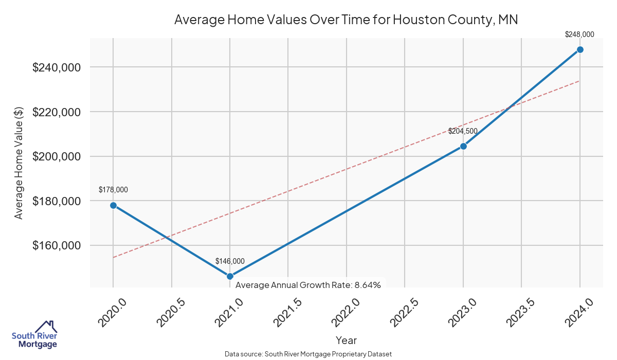 In 2024, there were 5 active reverse mortgage loans in Houston County, Minnesota. The average home value in Houston County is $246,168.60.