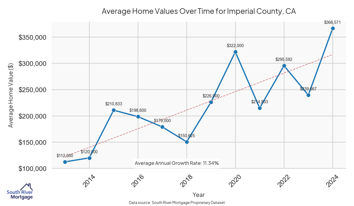 In 2024, there were 51 active reverse mortgage loans in Imperial County, California. The average home value in Imperial County is $360,025.16.