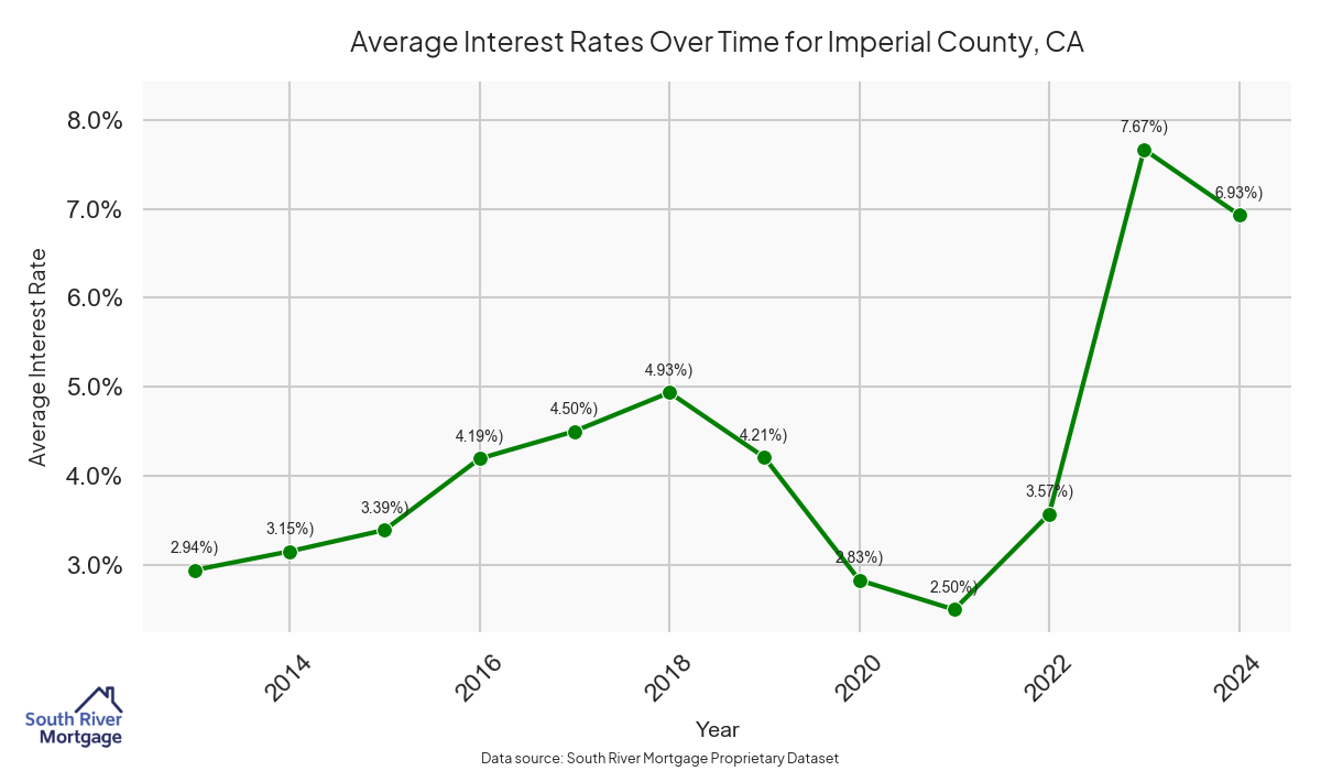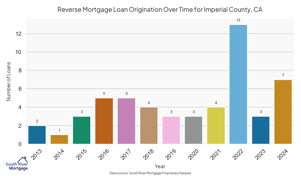 There are approximately 51 active reverse mortgage loans in Imperial County. The average interest rate in Imperial County is 7.49% for reverse mortgages. The average maximum claim amount (the lesser of the appraisal or lending limit), among reverse mortgage borrowers, in Imperial County was $263,571.43 in 2024.