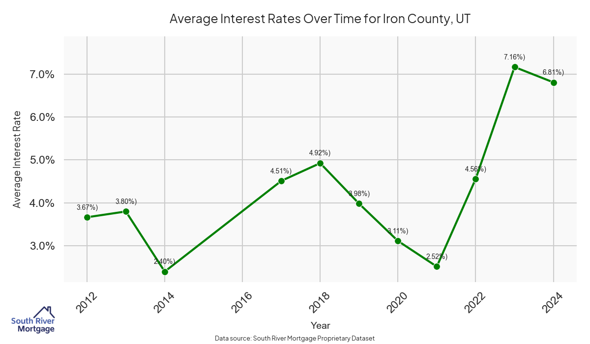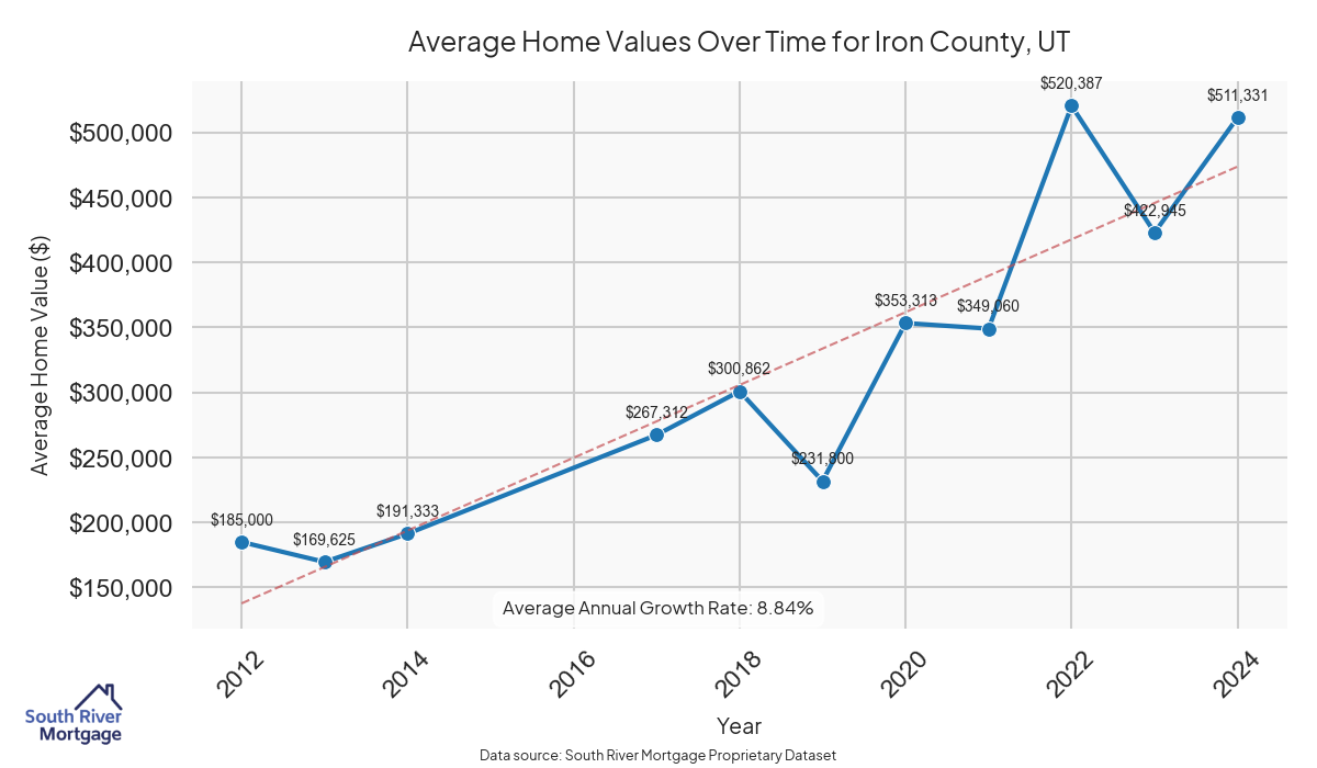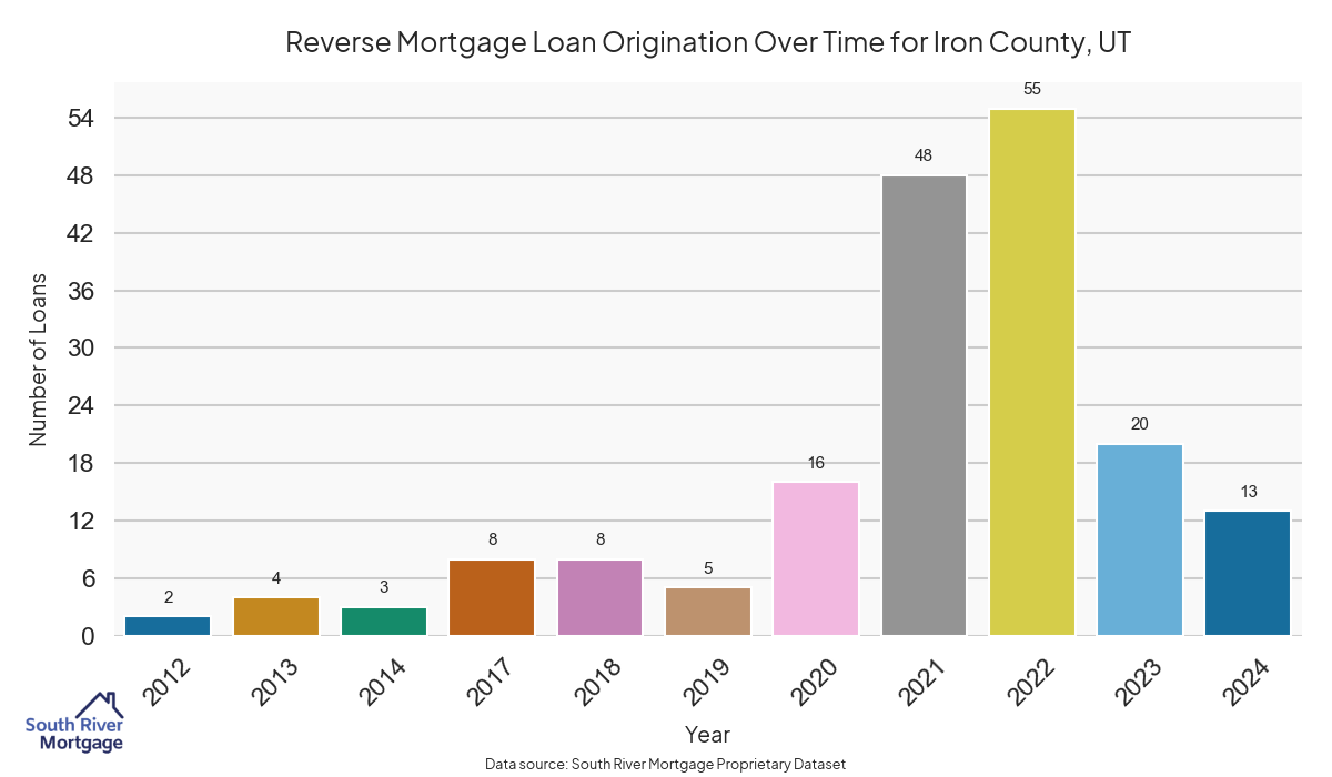 In 2024, there were 174 active reverse mortgage loans in Iron County, Utah. The average home value in Iron County is $424,116.23.