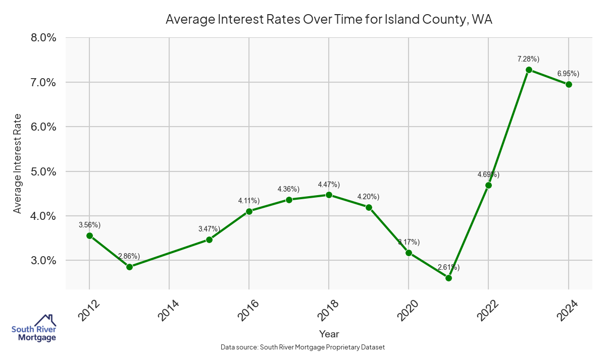 There are approximately 280 active reverse mortgage loans in Island County. The average interest rate in Island County is 7.59% for reverse mortgages. The average maximum claim amount (the lesser of the appraisal or lending limit), among reverse mortgage borrowers, in Island County was $748,469.39 in 2024.