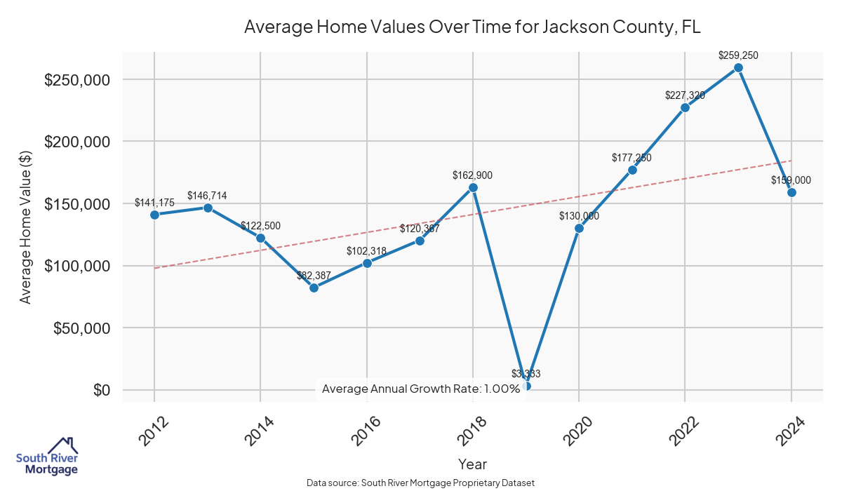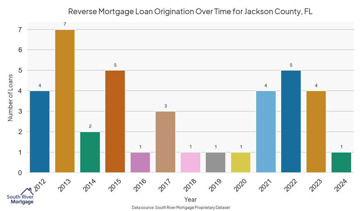 In 2024, there were 35 active reverse mortgage loans in Jackson County, Florida. The average home value in Jackson County is $156,451.83.