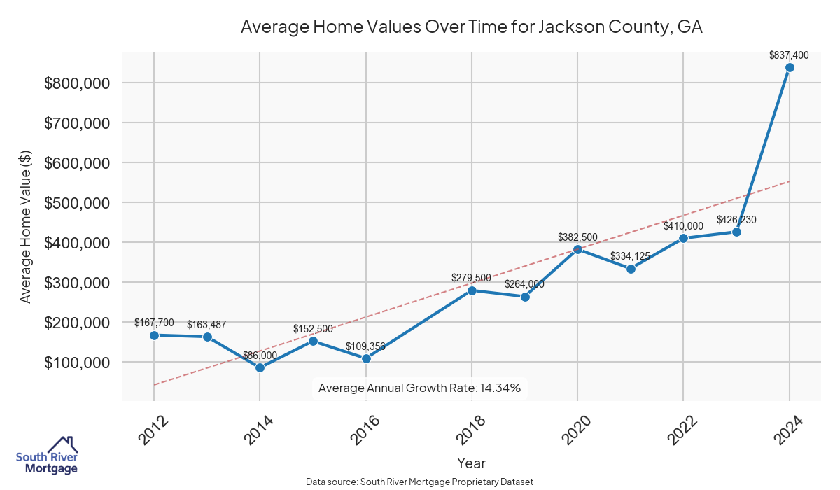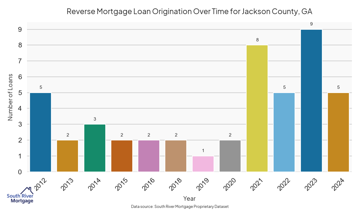 In 2024, there were 46 active reverse mortgage loans in Jackson County, Georgia. The average home value in Jackson County is $398,275.78.