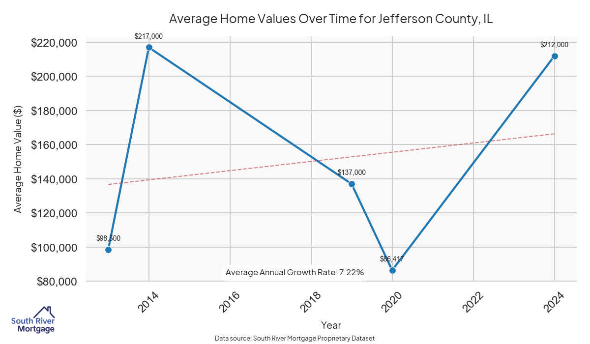 In 2024, there were 6 active reverse mortgage loans in Jefferson County, Illinois. The average home value in Jefferson County is $214,819.00.