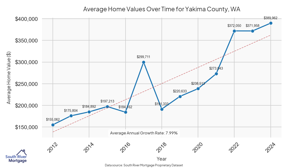 There are approximately 209 active reverse mortgage loans in Yakima County. The average interest rate in Yakima County is 7.53% for reverse mortgages. The average maximum claim amount (the lesser of the appraisal or lending limit), among reverse mortgage borrowers, in Yakima County was $360,200.00 in 2024.
