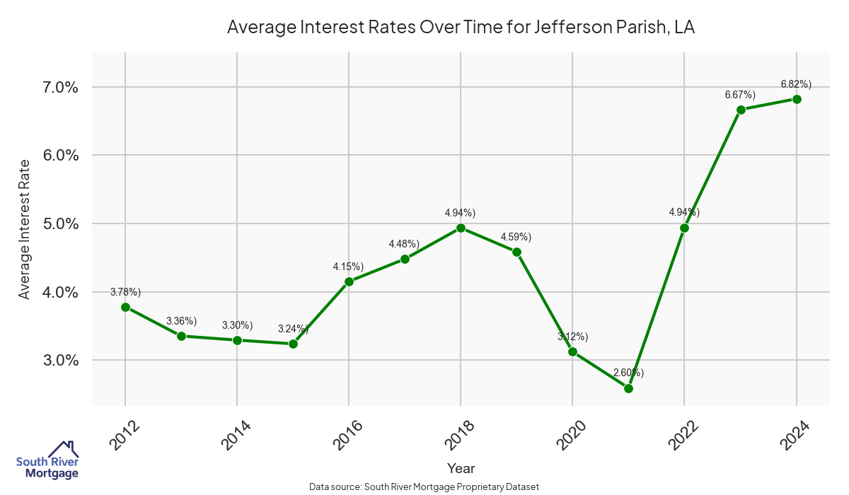 There are approximately 541 active reverse mortgage loans in Jefferson Parish. The average interest rate in Jefferson Parish is 7.59% for reverse mortgages. The average maximum claim amount (the lesser of the appraisal or lending limit), among reverse mortgage borrowers, in Jefferson Parish was $340,151.52 in 2024.