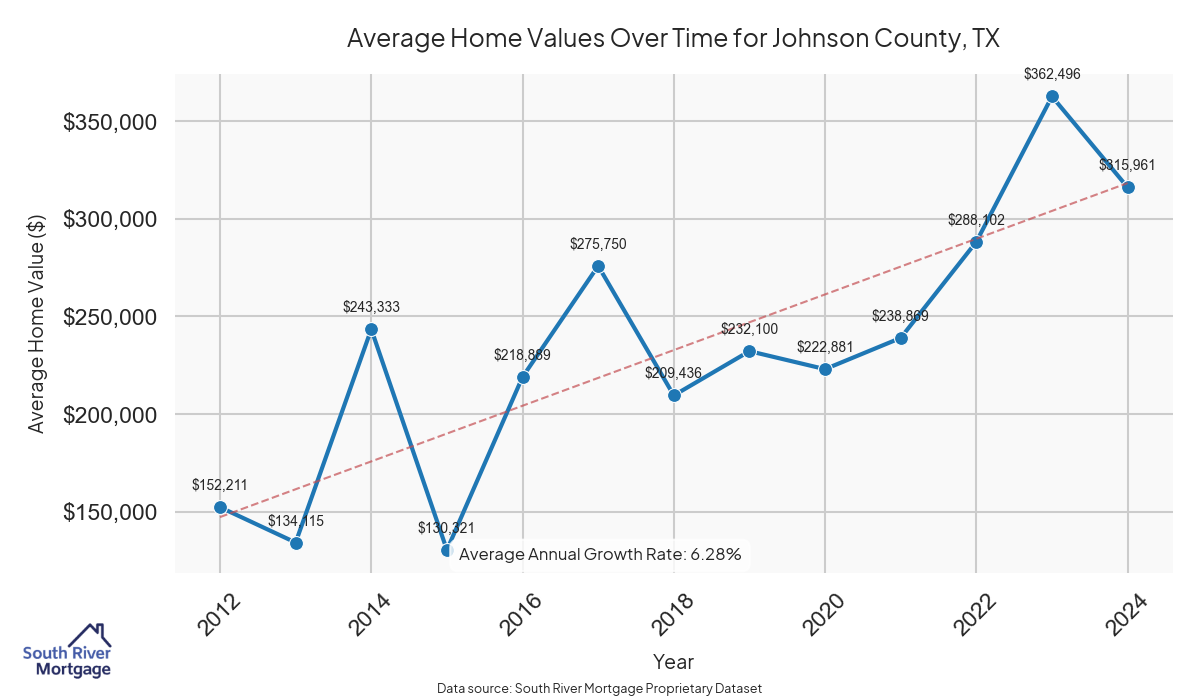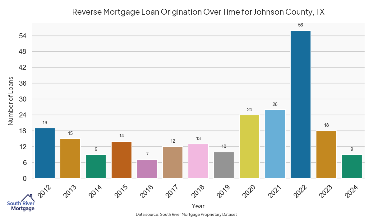 In 2024, there were 205 active reverse mortgage loans in Johnson County, Texas. The average home value in Johnson County is $341,276.84.