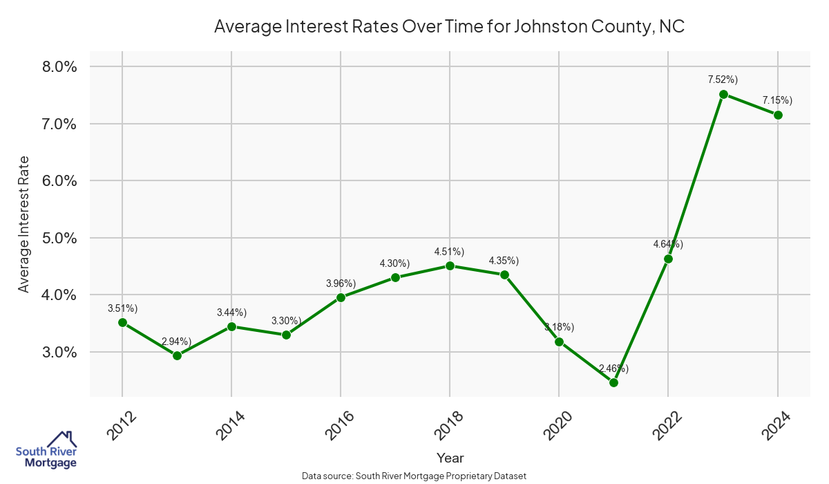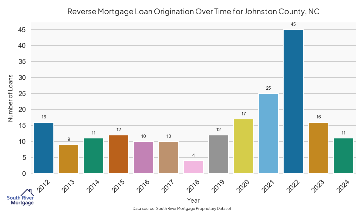 There are approximately 193 active reverse mortgage loans in Johnston County. The average interest rate in Johnston County is 7.54% for reverse mortgages. The average maximum claim amount (the lesser of the appraisal or lending limit), among reverse mortgage borrowers, in Johnston County was $369,000.00 in 2024.