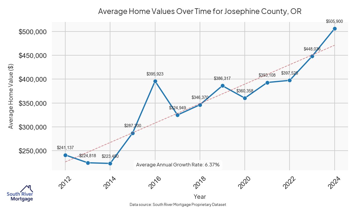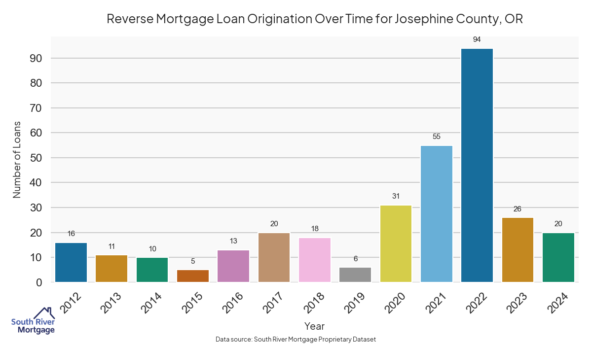 In 2024, there were 291 active reverse mortgage loans in Josephine County, Oregon. The average home value in Josephine County is $477,165.31.