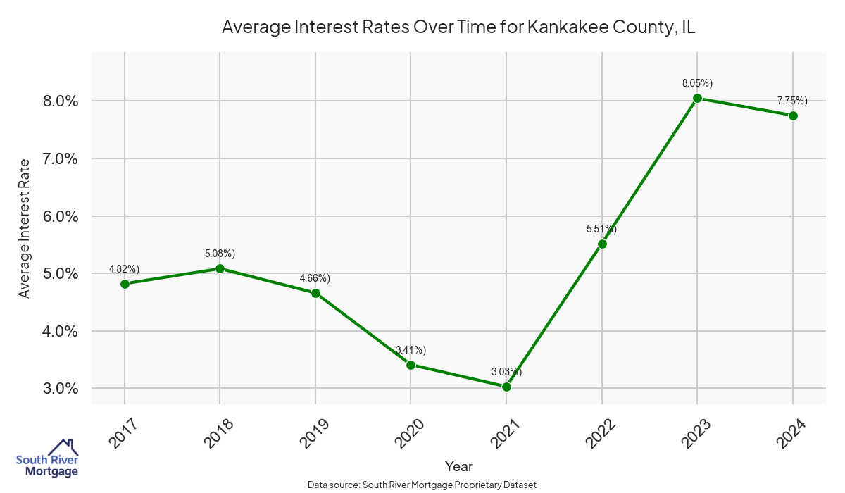 There are approximately 34 active reverse mortgage loans in Kankakee County. The average interest rate in Kankakee County is 7.79% for reverse mortgages. The average maximum claim amount (the lesser of the appraisal or lending limit), among reverse mortgage borrowers, in Kankakee County was $150,000.00 in 2024.