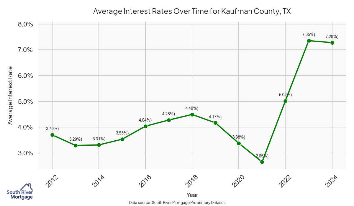 There are approximately 74 active reverse mortgage loans in Kaufman County. The average interest rate in Kaufman County is 7.72% for reverse mortgages. The average maximum claim amount (the lesser of the appraisal or lending limit), among reverse mortgage borrowers, in Kaufman County was $321,451.61 in 2024.