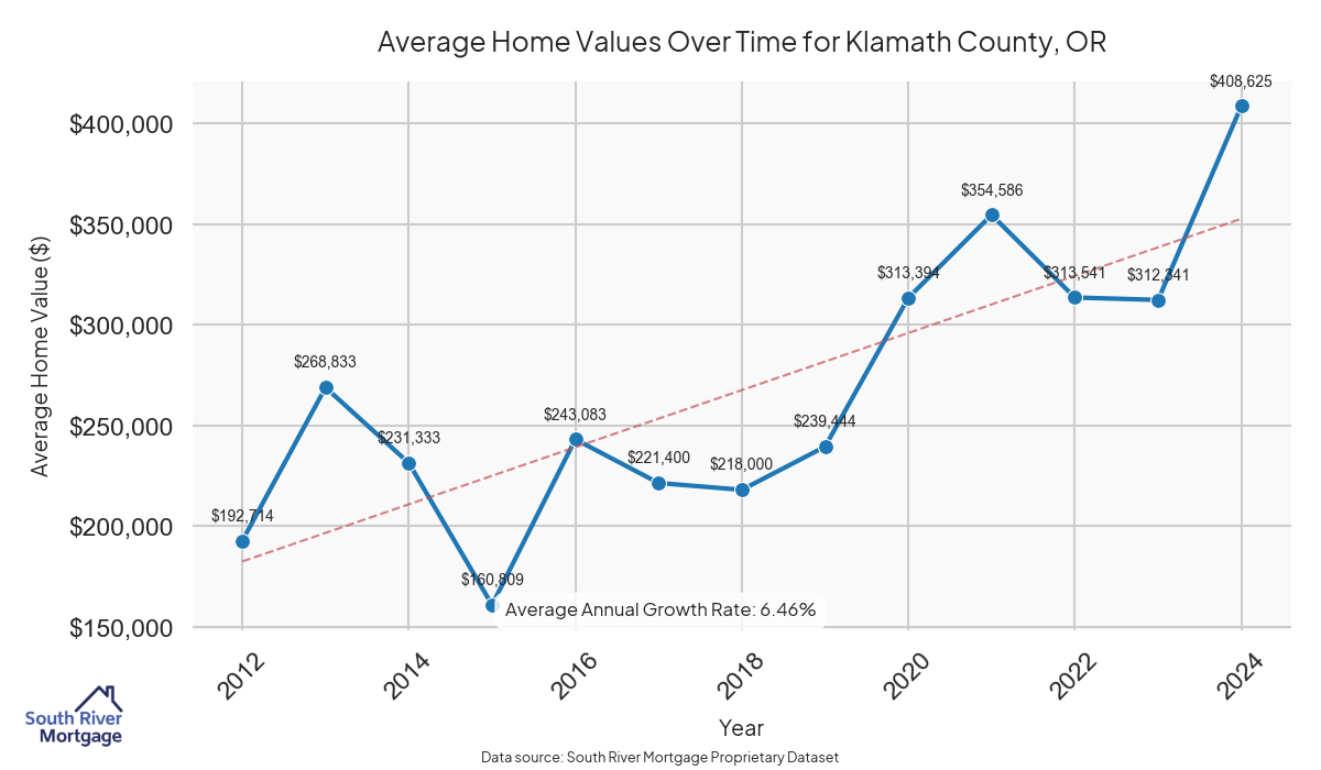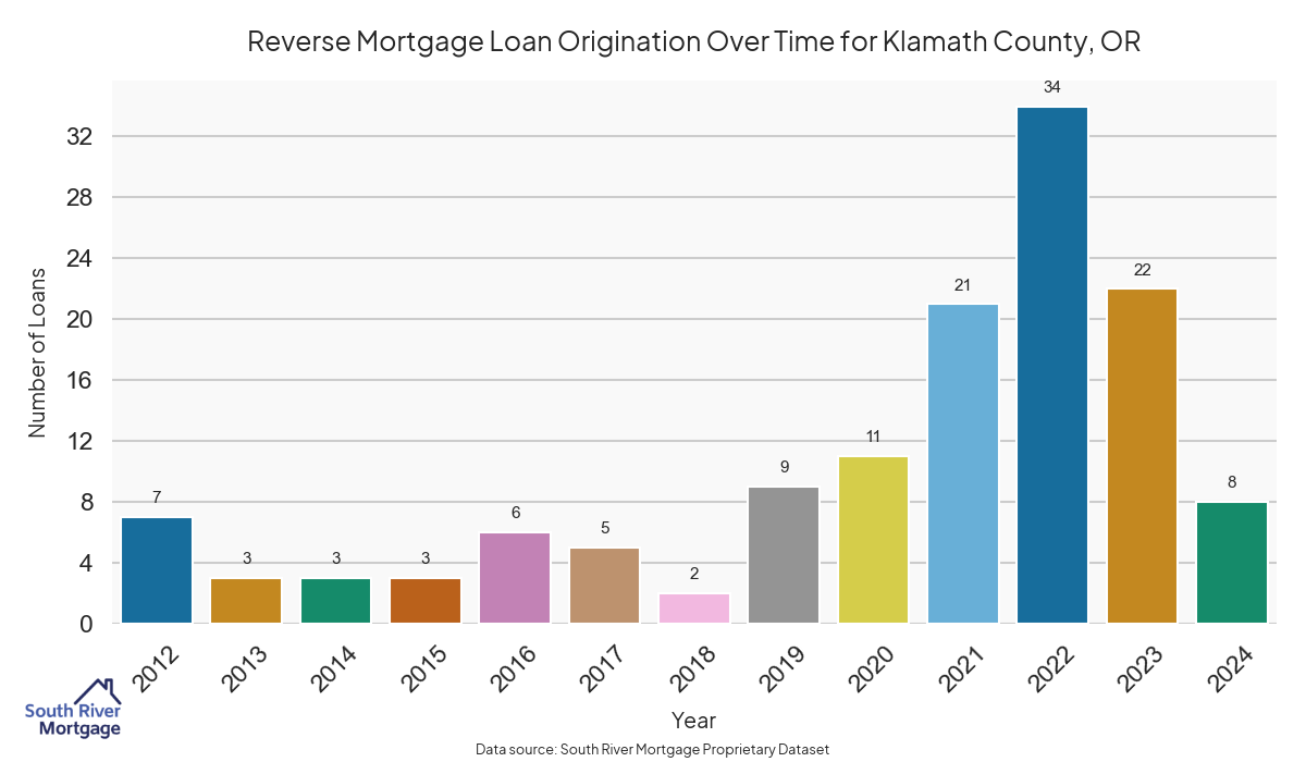 In 2024, there were 124 active reverse mortgage loans in Klamath County, Oregon. The average home value in Klamath County is $347,742.98.