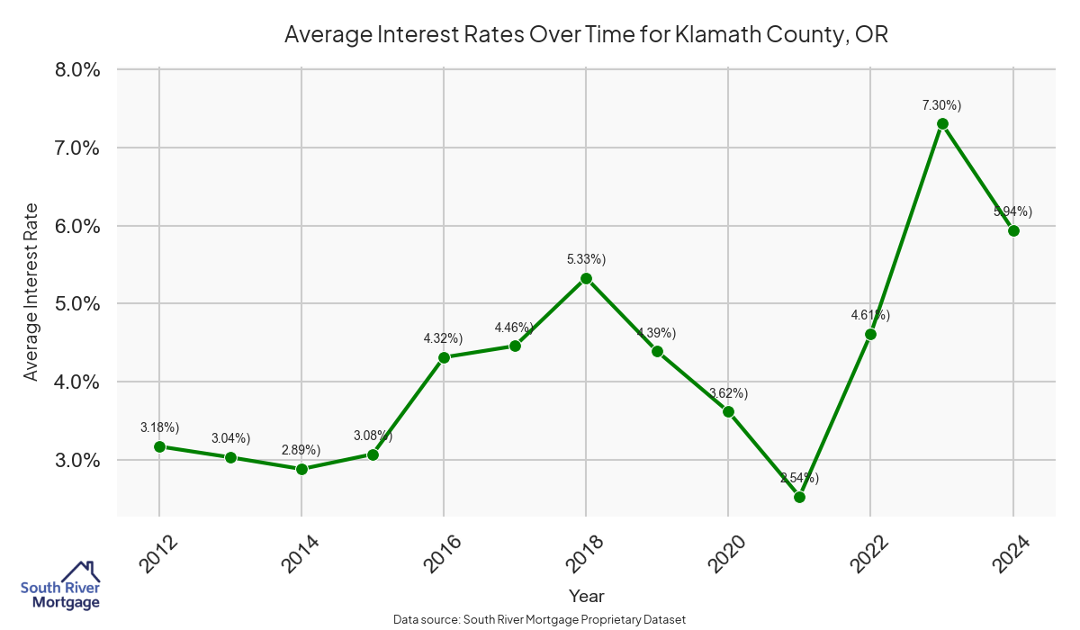 There are approximately 124 active reverse mortgage loans in Klamath County. The average interest rate in Klamath County is 7.26% for reverse mortgages. The average maximum claim amount (the lesser of the appraisal or lending limit), among reverse mortgage borrowers, in Klamath County was $320,185.19 in 2024.