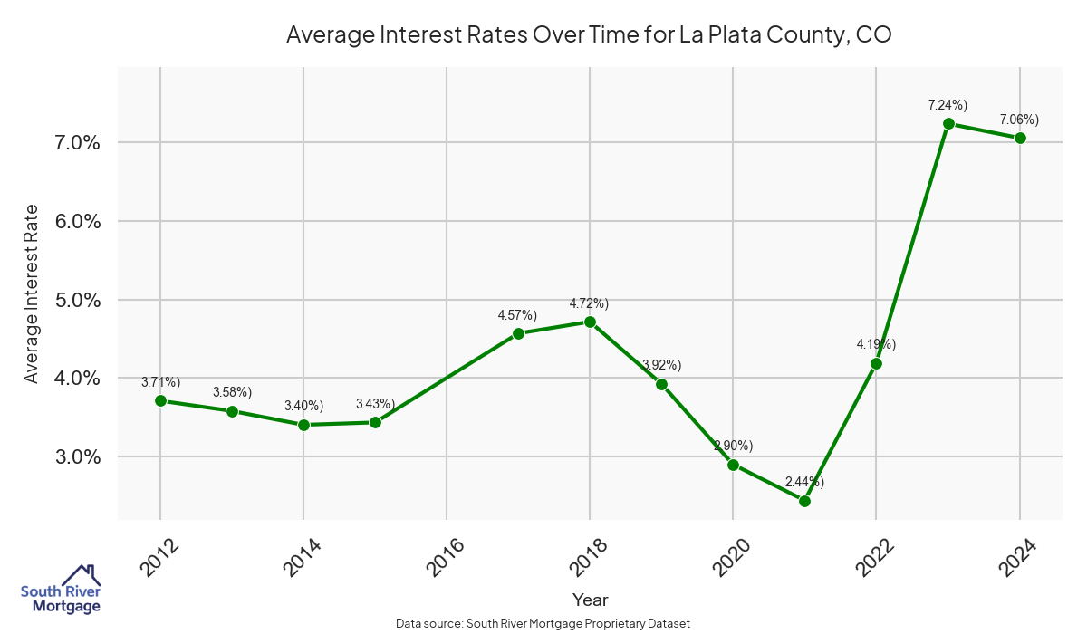 There are approximately 120 active reverse mortgage loans in La Plata County. The average interest rate in La Plata County is 7.84% for reverse mortgages. The average maximum claim amount (the lesser of the appraisal or lending limit), among reverse mortgage borrowers, in La Plata County was $1,024,230.77 in 2024.