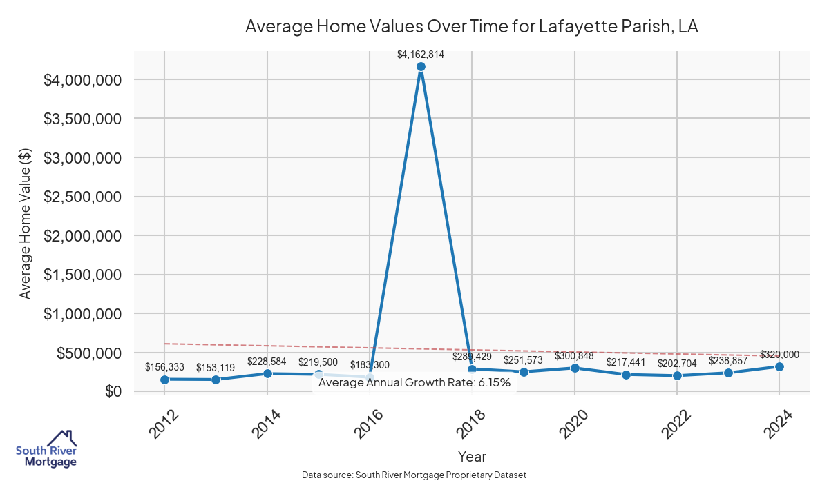 In 2024, there were 121 active reverse mortgage loans in Lafayette Parish, Louisiana. The average home value in Lafayette Parish is $249,703.29.
