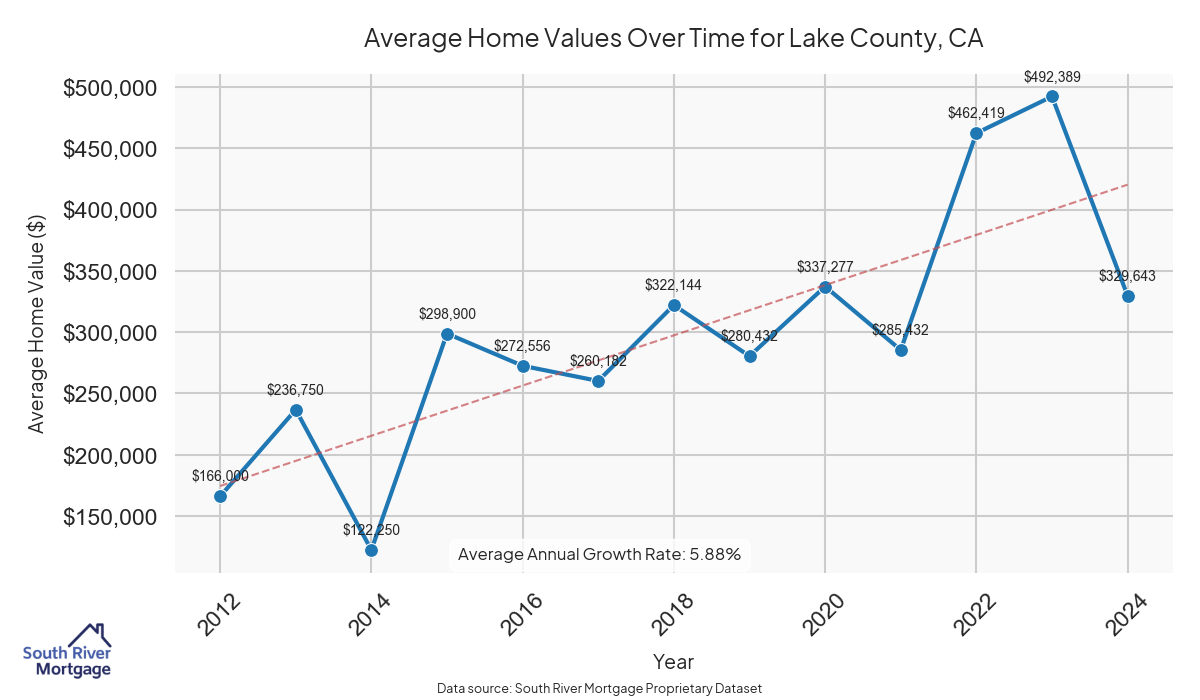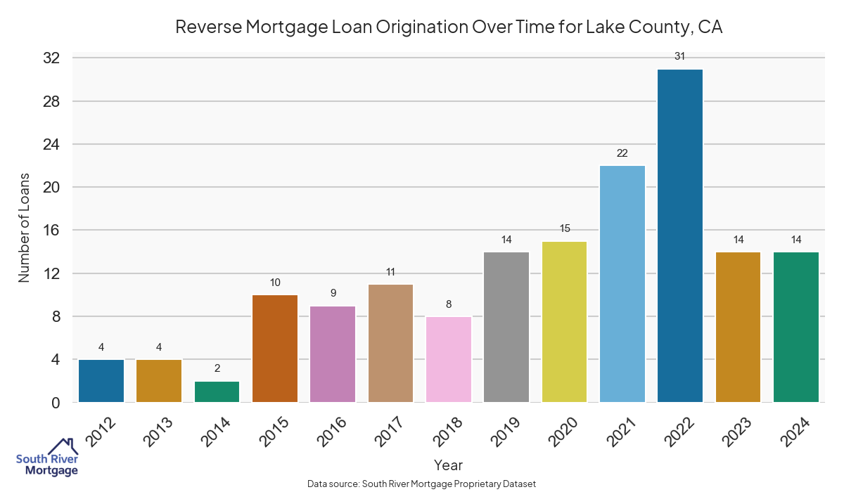 In 2024, there were 130 active reverse mortgage loans in Lake County, California. The average home value in Lake County is $460,920.28.