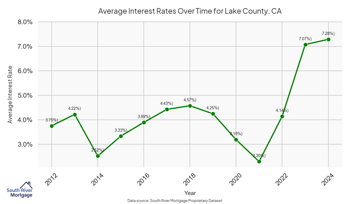 There are approximately 130 active reverse mortgage loans in Lake County. The average interest rate in Lake County is 7.77% for reverse mortgages. The average maximum claim amount (the lesser of the appraisal or lending limit), among reverse mortgage borrowers, in Lake County was $405,833.33 in 2024.