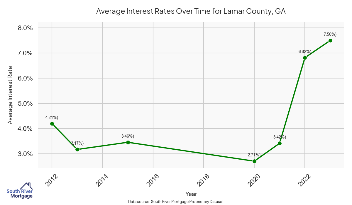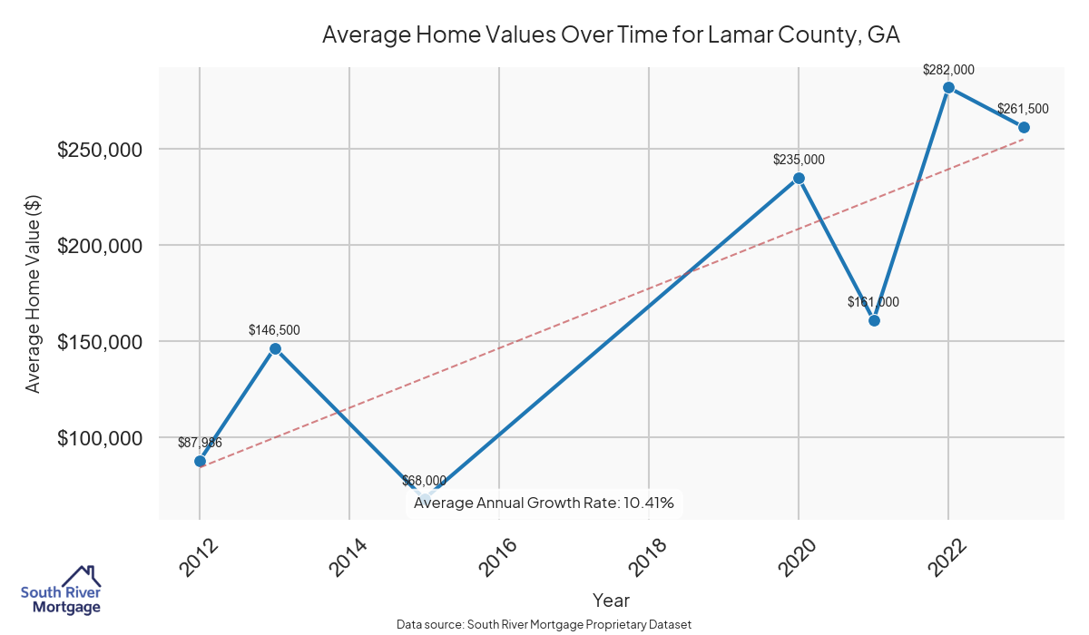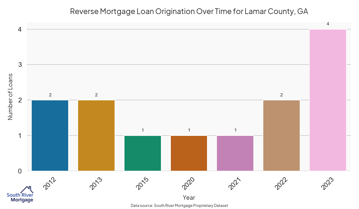 In 2024, there were 12 active reverse mortgage loans in Lamar County, Georgia. The average home value in Lamar County is $234,503.00.