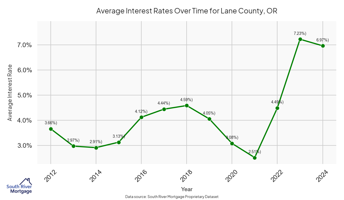 There are approximately 698 active reverse mortgage loans in Lane County. The average interest rate in Lane County is 7.27% for reverse mortgages. The average maximum claim amount (the lesser of the appraisal or lending limit), among reverse mortgage borrowers, in Lane County was $468,625.00 in 2024.