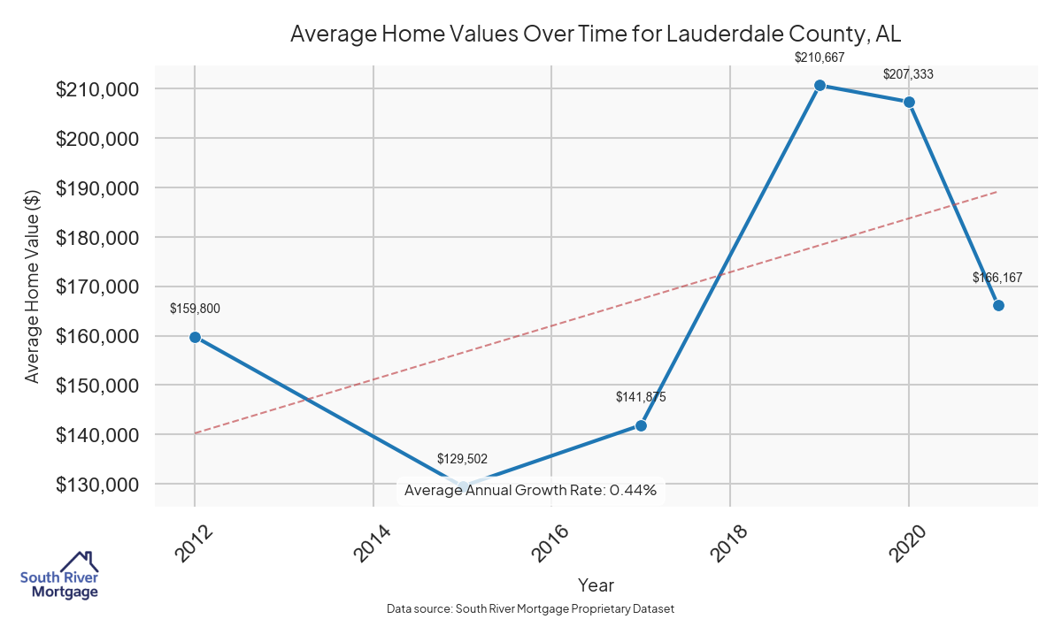 In 2024, there were 28 active reverse mortgage loans in Lauderdale County, Alabama. The average home value in Lauderdale County is $295,179.14.