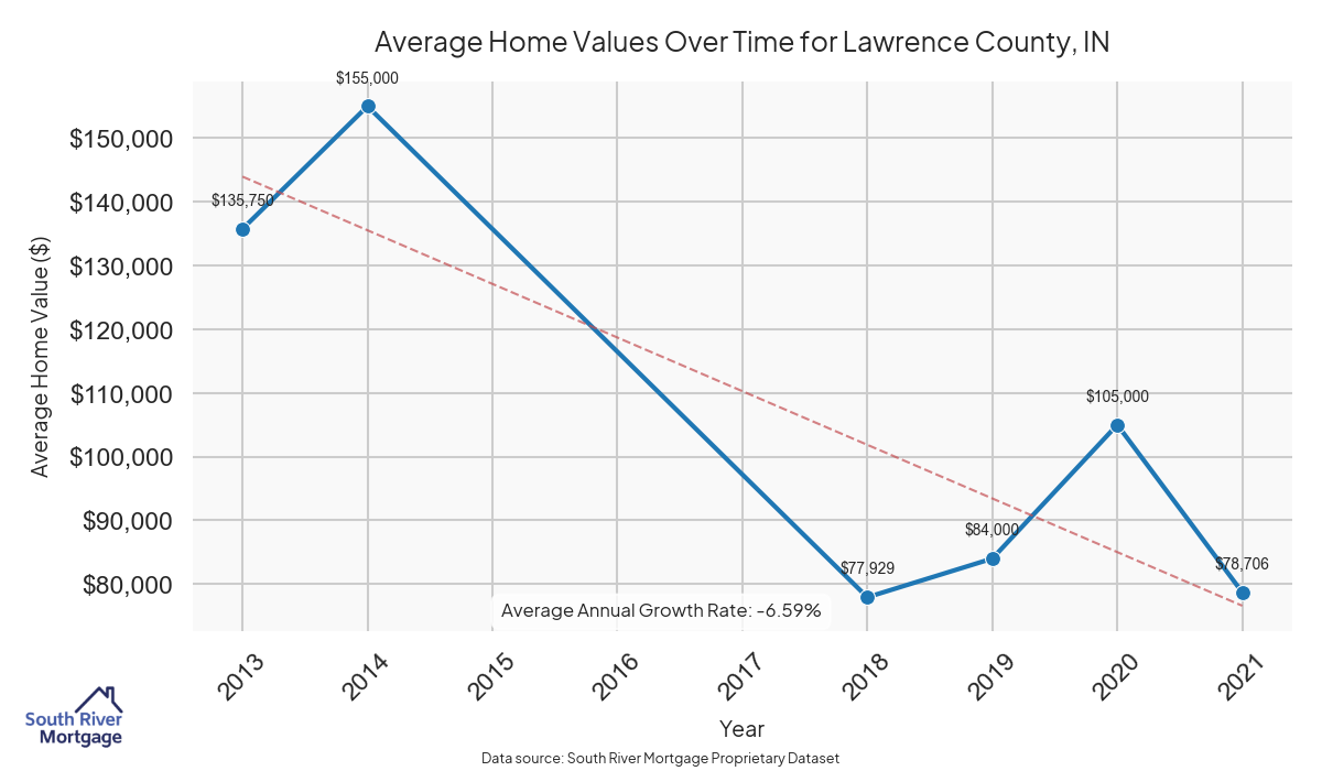 In 2024, there were 13 active reverse mortgage loans in Lawrence County, Indiana. The average home value in Lawrence County is $201,547.54.