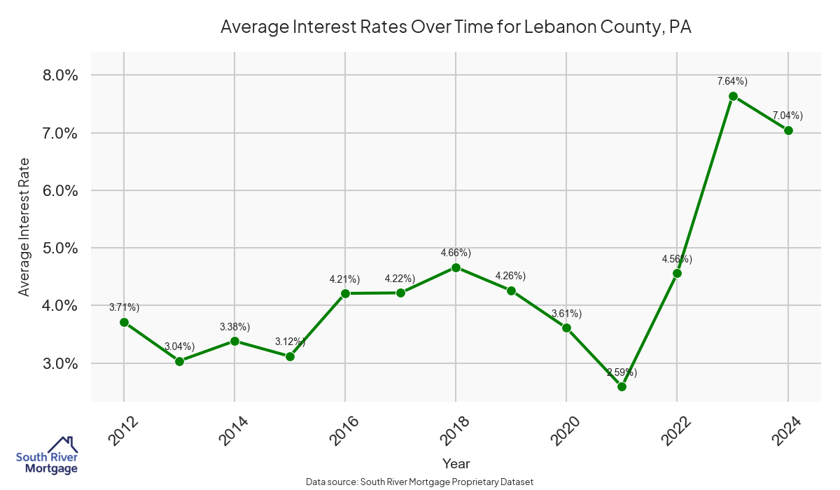 There are approximately 97 active reverse mortgage loans in Lebanon County. The average interest rate in Lebanon County is 7.66% for reverse mortgages. The average maximum claim amount (the lesser of the appraisal or lending limit), among reverse mortgage borrowers, in Lebanon County was $352,500.00 in 2024.