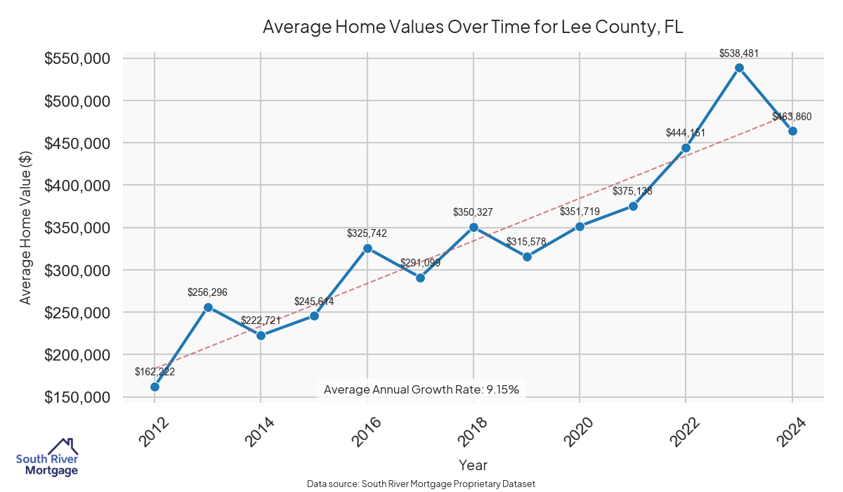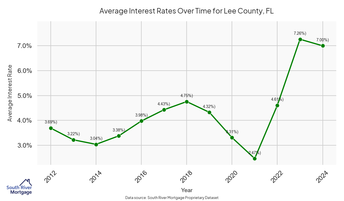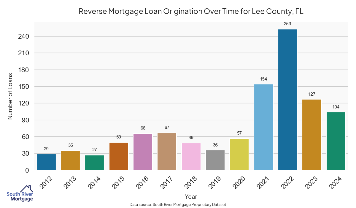 There are approximately 1043 active reverse mortgage loans in Lee County. The average interest rate in Lee County is 7.53% for reverse mortgages. The average maximum claim amount (the lesser of the appraisal or lending limit), among reverse mortgage borrowers, in Lee County was $592,828.57 in 2024.