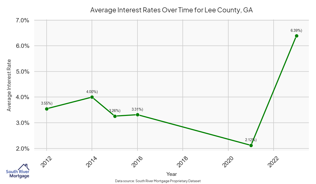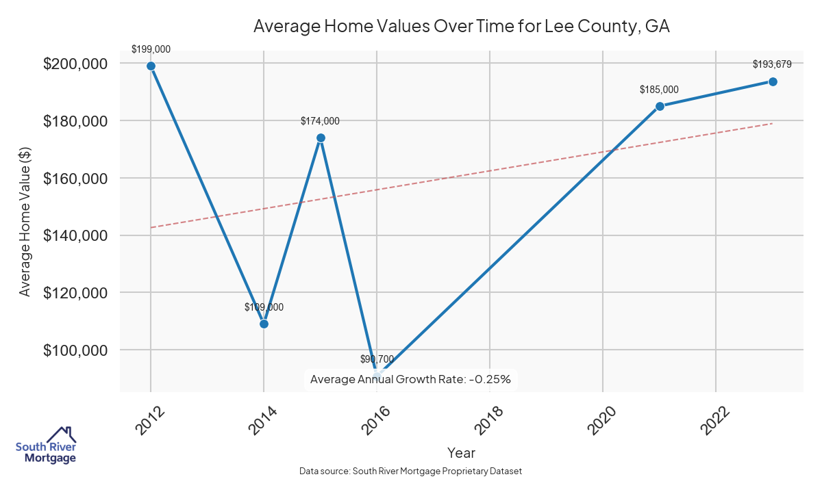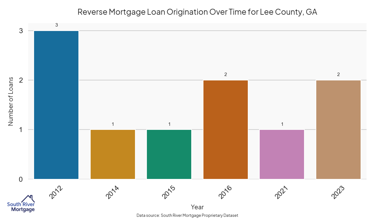 In 2024, there were 9 active reverse mortgage loans in Lee County, Georgia. The average home value in Lee County is $255,278.00.
