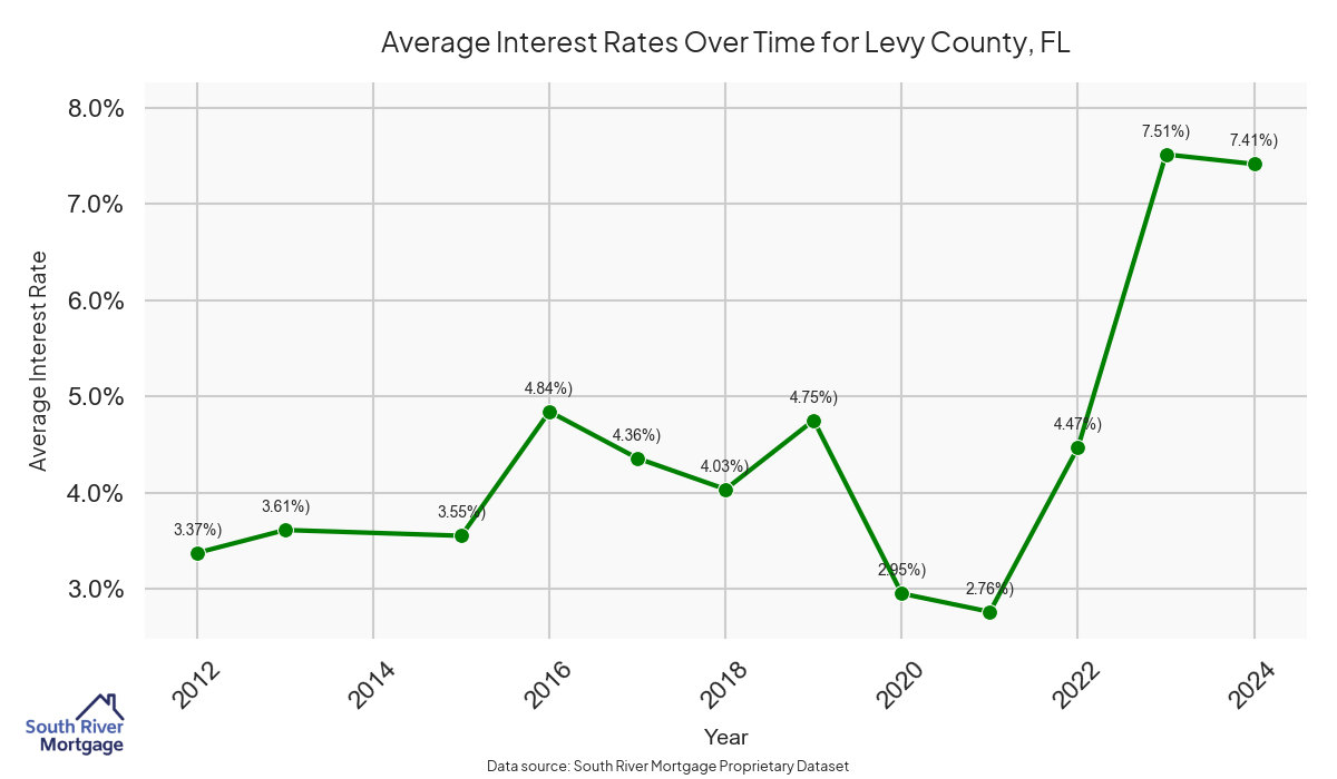 There are approximately 42 active reverse mortgage loans in Levy County. The average interest rate in Levy County is 7.59% for reverse mortgages. The average maximum claim amount (the lesser of the appraisal or lending limit), among reverse mortgage borrowers, in Levy County was $347,000.00 in 2024.