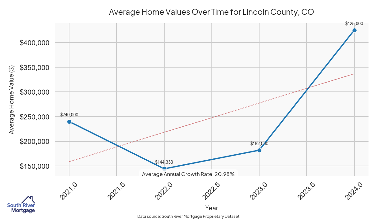 In 2024, there were 5 active reverse mortgage loans in Lincoln County, Colorado. The average home value in Lincoln County is $287,348.40.