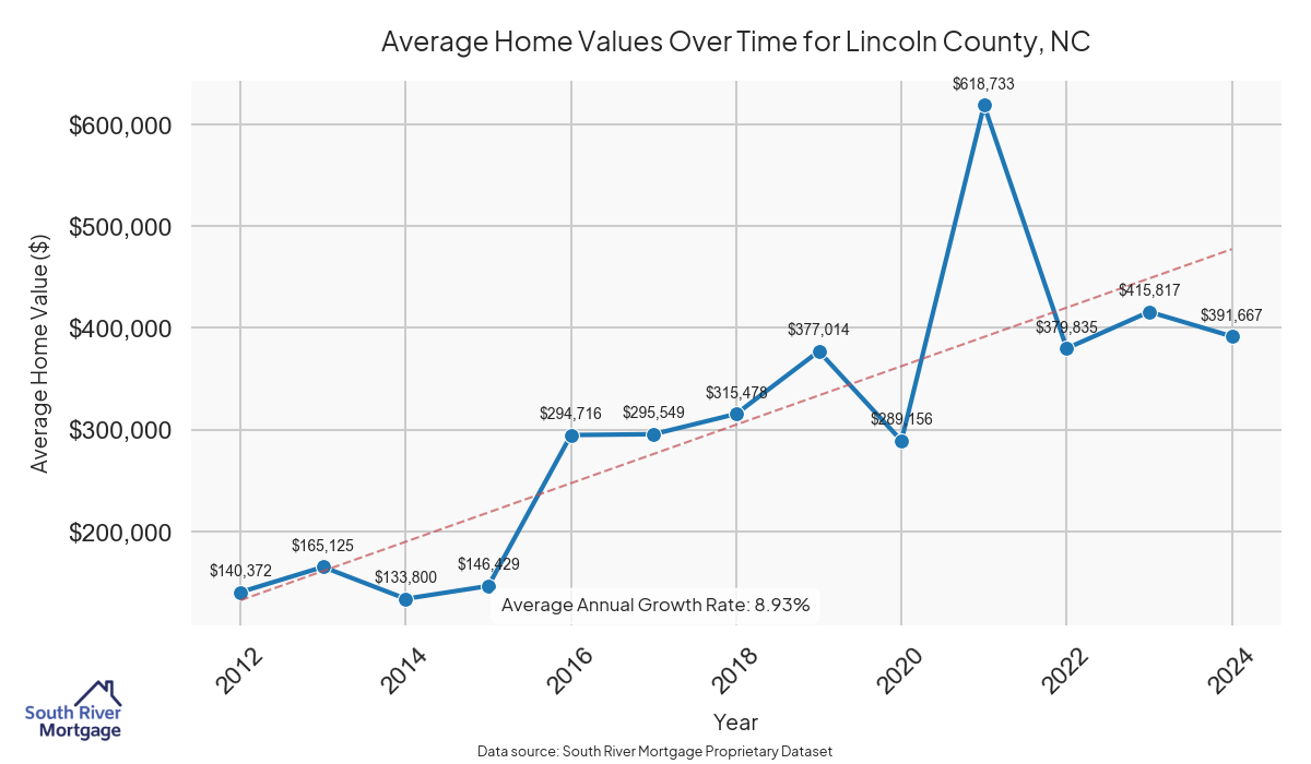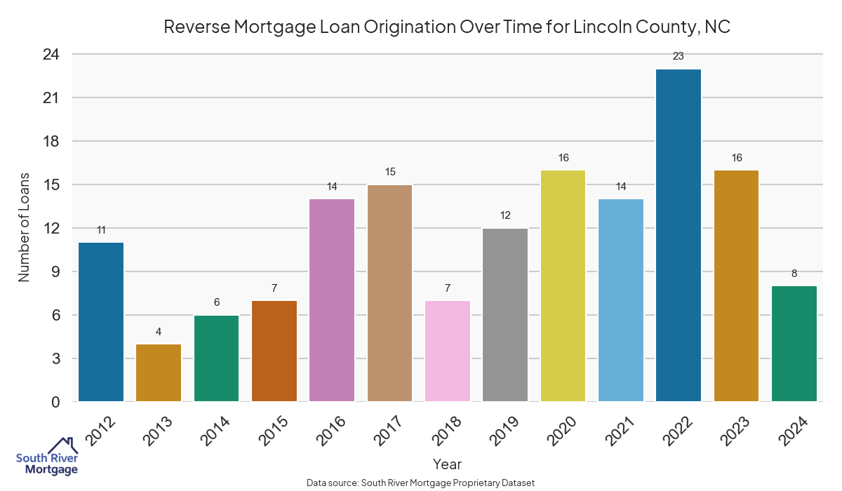 In 2024, there were 153 active reverse mortgage loans in Lincoln County, North Carolina. The average home value in Lincoln County is $475,615.25.