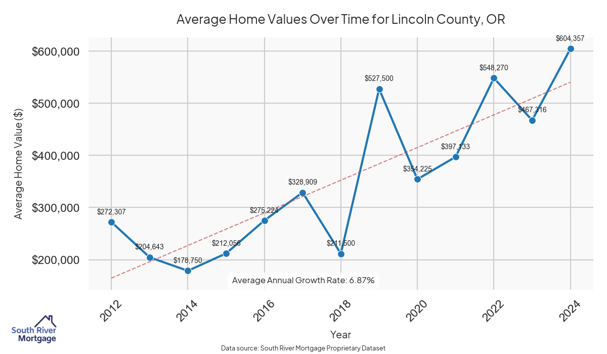 In 2024, there were 162 active reverse mortgage loans in Lincoln County, Oregon. The average home value in Lincoln County is $583,170.75.