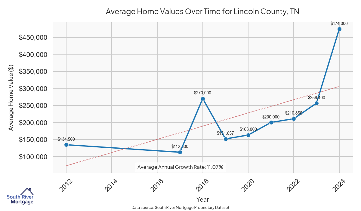 In 2024, there were 22 active reverse mortgage loans in Lincoln County, Tennessee. The average home value in Lincoln County is $220,310.27.